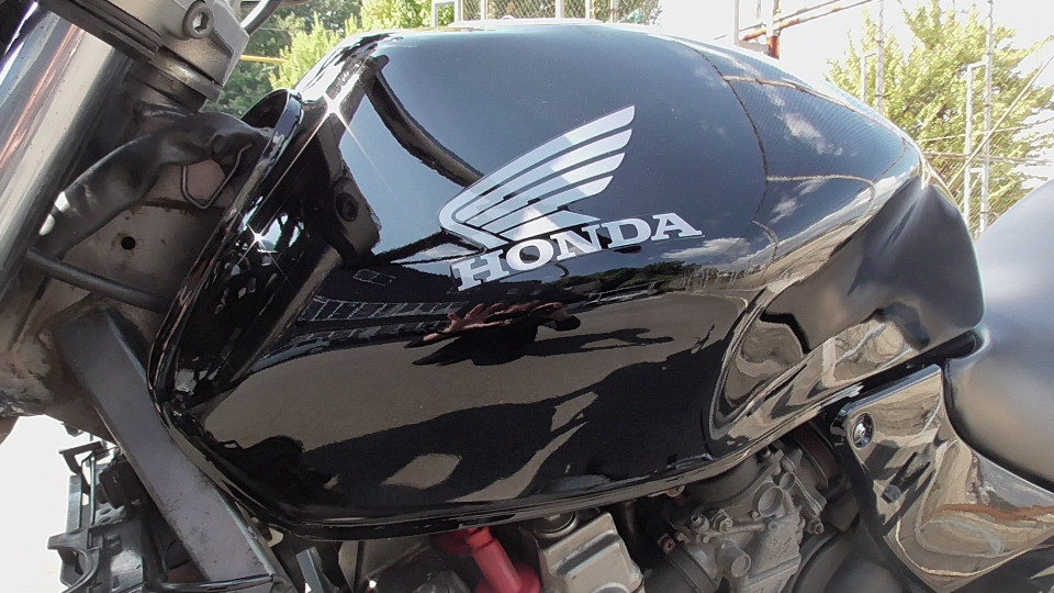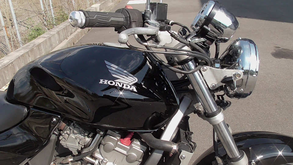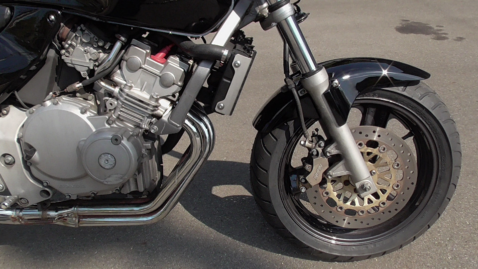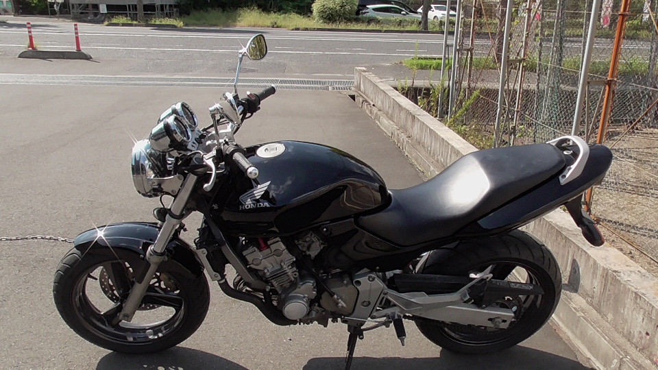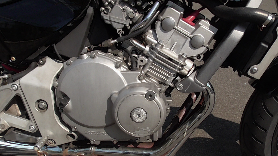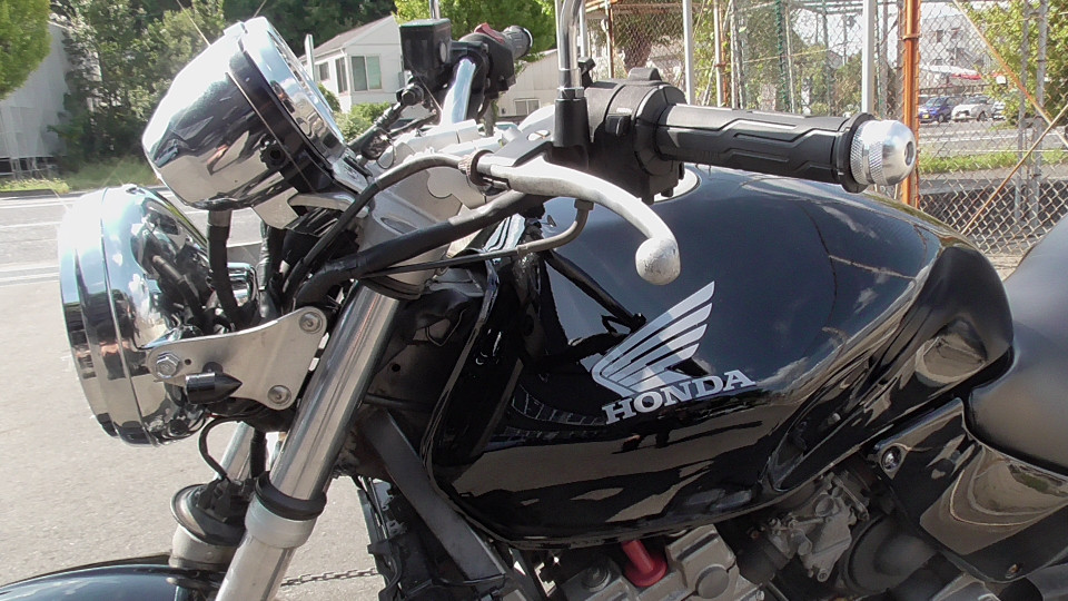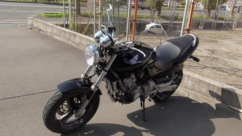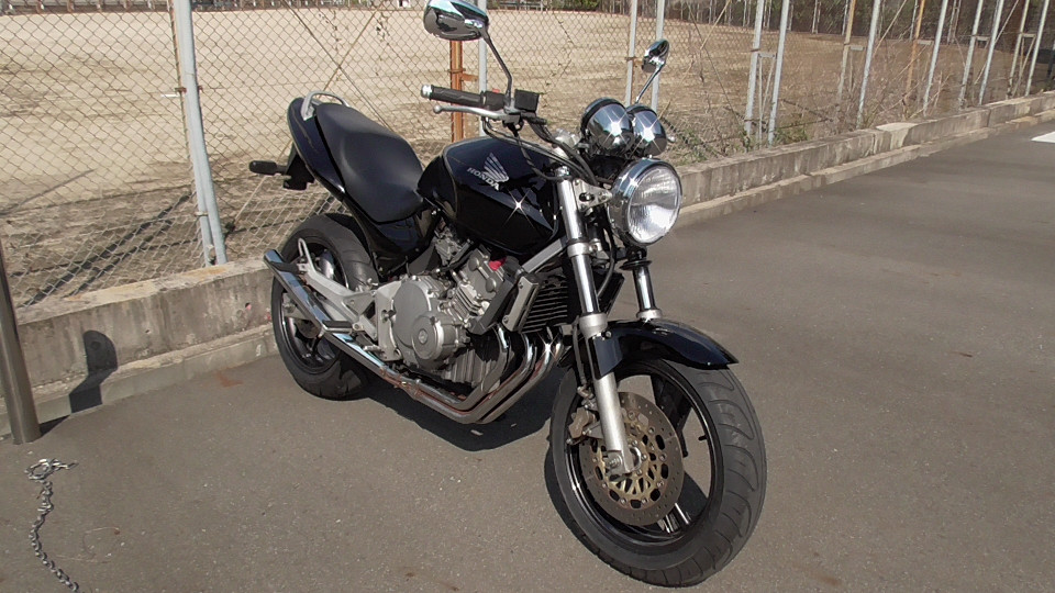商品ID:1759294429:最安値に挑戦する、サウンドはバリオス、ふりかえればホーネット、バイクシティがお届けします。スポーツネイキッドの定番!人気のホーネット!見た目のかっこよさだけでなく、性能面も優れており、完成度の高いバイクです。社外集合管マフラー、LEDウインカー、テール。メーター交換タコメータースケール違いにつきレッドゾーンで走行OK。メーター交換前18721km。キャスター立ち気味